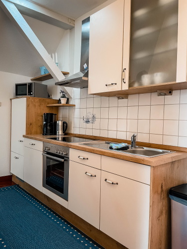 - Küchenzeile mit Spülmaschine, Umluftbackofen, Ceranfeld, Kühlschrank mit Gefrierfach, Küchenmaschine, Kaffeemaschine, Toaster, Wasserkocher